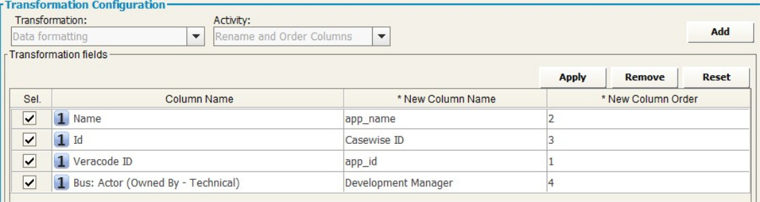 The Adapter, as mentioned, can be used to push data to Veracode and fill applications metadata. For example, if the application object type in Veracode has two custom fields named “Casewise ID” and “Development Manager”, the alignment can be done configuring a workflow, with a source providing values for the fields, and with the target operation “Web Service POST”, using the configured adapter. To provide mappings between source and target field, use a “Data Formatting: Rename and Order Columns” transformation, with the required “app_id” and “app_name” fields, and all others desired fields. Where “app_id” (numeric) value is null or 0, the application with provided name will be created, or updated, if an existing Veracode application with the same name already exists.