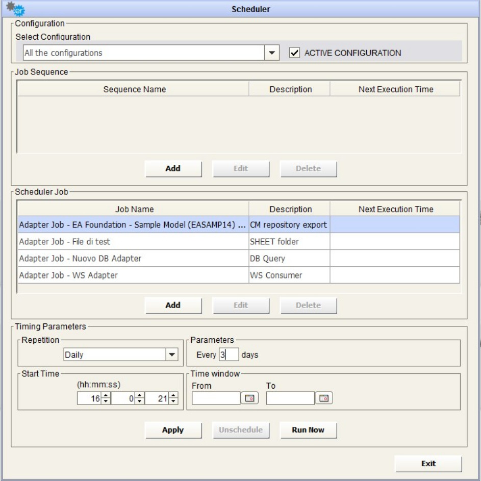 For each of the available Adapters, the user can set up the definition of single job to be scheduled (section “Job Scheduler”)