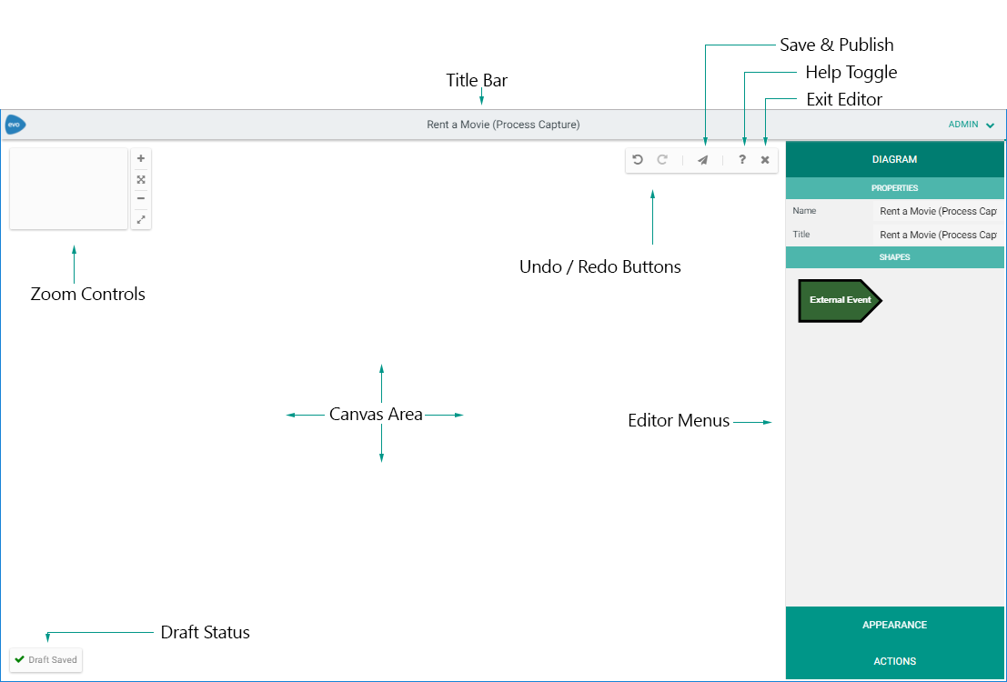 Home to the different BP Modeler Panes: Diagram, Appearance, and Actions. |