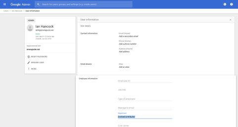 HOW AD GROUP WORKS: In G Suite you already setup SAML Groups and mapped the value from a User's "Department" to be used as the Group in Evolve. When the value returned by G Suite matches one of the values in "AD Group", Evolve creates the user with the permissions specified on that line. e.g. A User who has the "Department" = "EvolveContributor", will be created with a "Contributor" Licence, in the Group "EvolveContributor". This will mean in Model Explorer you will see a new User added, with a Category "Contributor", and they will be associated with the group "EvolveContributor", which will give them access to whatever models are available to that group. In addition, we see that it will also give them a Role, "Administrator". This is an Evolve role, and will dictate what views and pages they see in the Evolve site. See below, where a User's department is set in the profile.