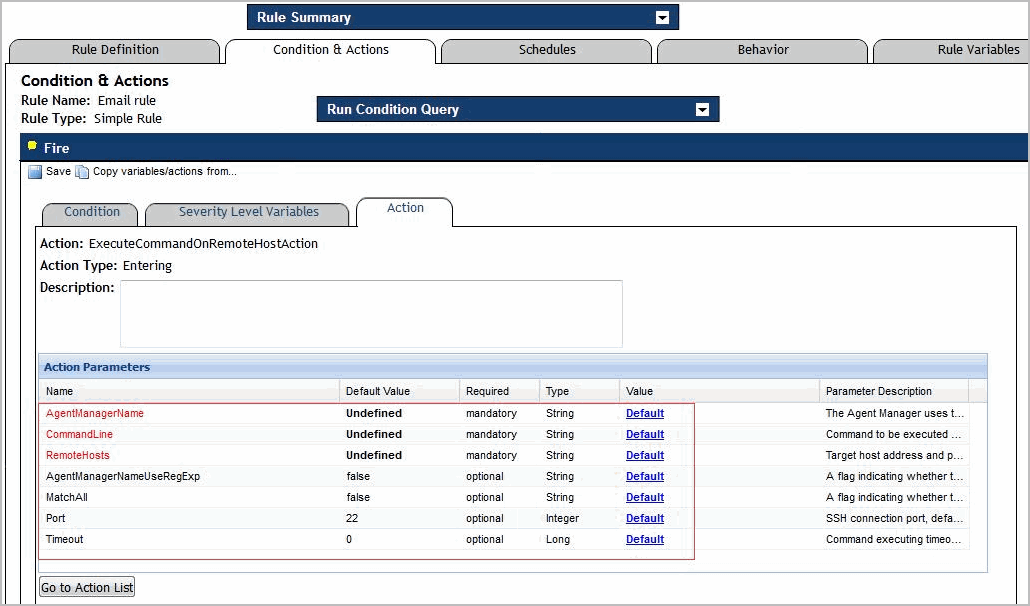 Add the ExecuteCommandOnRemoteHostsAction action to your rule list. For more information about how to add or edit an action in a rule, refer to the Getting Started: create a new rule or Getting Started: view and edit rule definitions section in the Foglight Administration and Configuration Help.