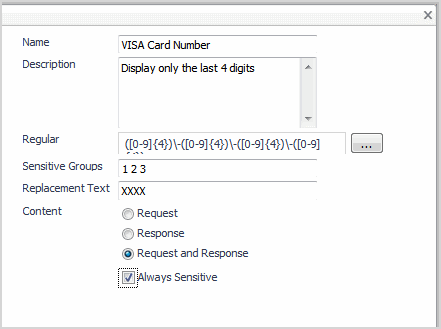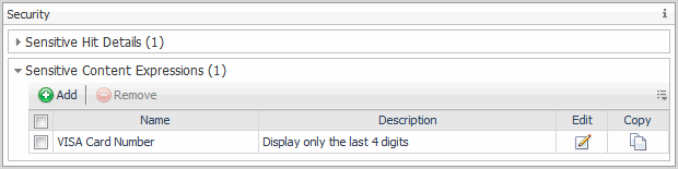 To define sensitive content expressions, navigate to APM > Configure > Traffic Analysis, and expand Sensitive Content Expressions.