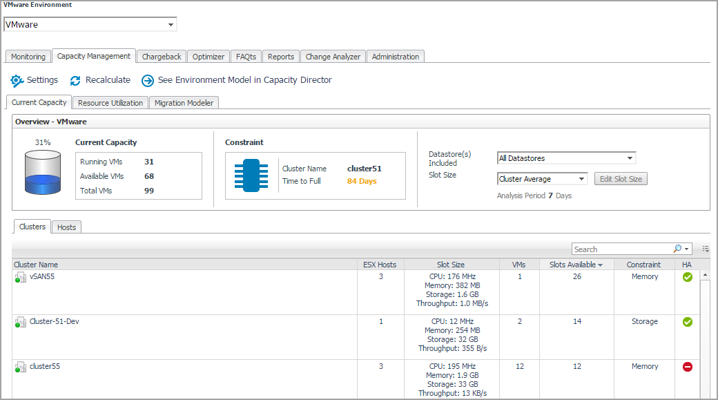 Foglight® Capacity Director Lite delivers an essential capacity management for virtual infrastructure. Get deep insight into your environment, including the availability and estimated time left for CPU, memory, storage, and Input/Output Operations Per Second (IOPs). Use historical trends to better forecast resource requirements for clusters, hosts, and workloads—and proactively predict and budget for capital expenditures.