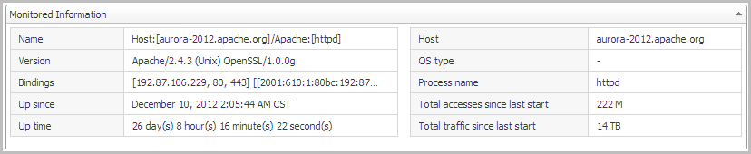 You can drill down to this view by clicking a web server name on the Summary – All Apache Web Servers view, or by clicking Explore on the Summary – <WebServerName> view.