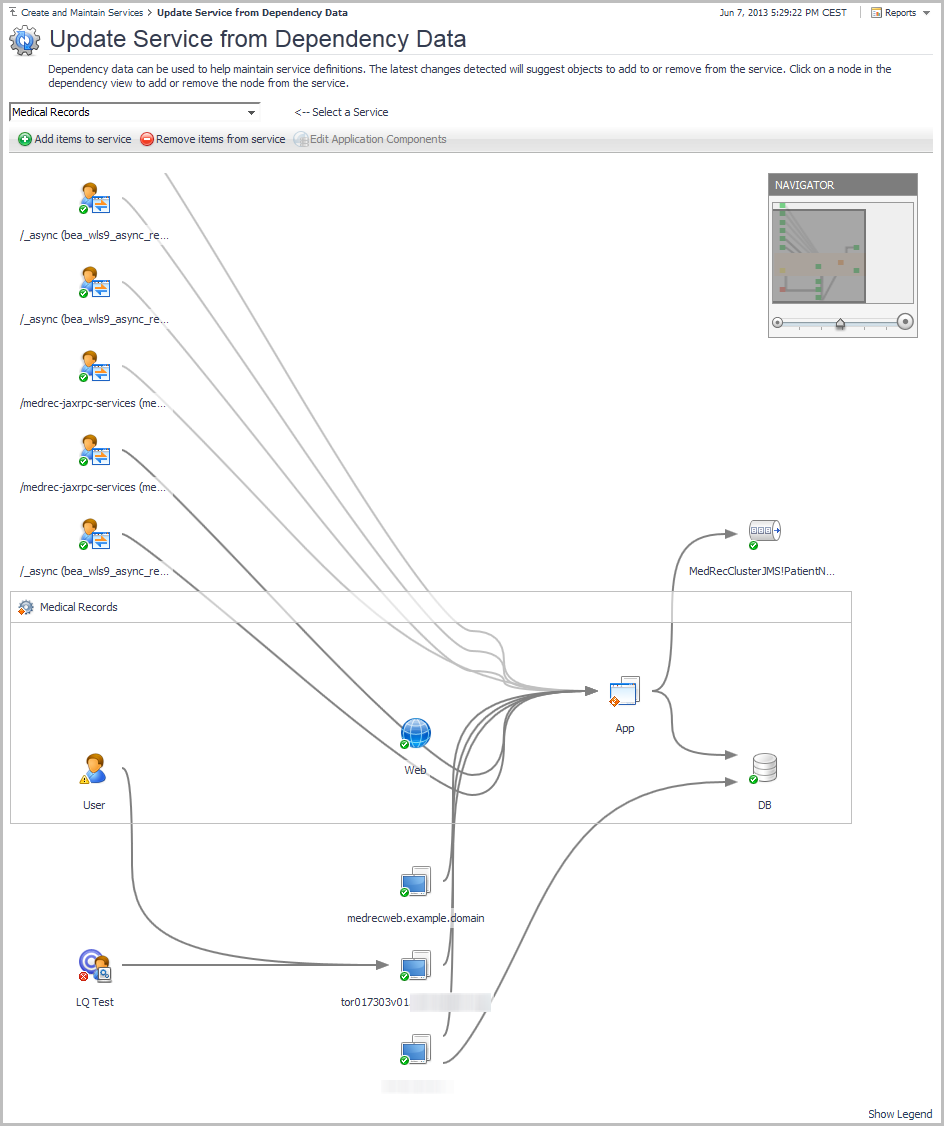 The information presented is precalculated, based on the changes that occurred before the Last Change Detected. Selecting a service from the list displays the service dependency map in real time. Observed dependency changes are highlighted using a set of conventions, as presented in the legend (click Show Legend in the lower right corner of the dashboard).