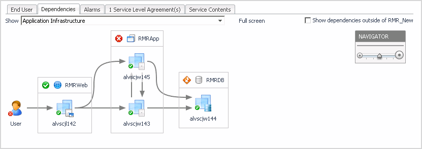 The Dependencies tab focuses on observed (or manually asserted) relationships between elements (or elements contained within a service). On this tab, monitor service dependencies with the following rollup levels: