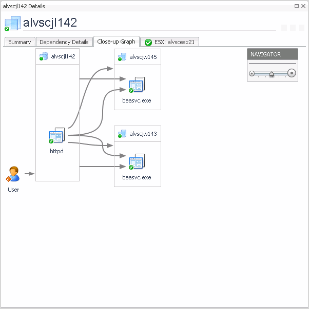 From the Dependencies tab, you can drill down and view more details about any component on the map (host or service). For host components, you can also view detailed information about any application components running on these hosts.