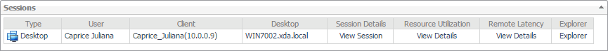 General information about the session, such as its type (desktop or application), the user running the session, client name, desktop name, additional session details, resource utilization, and latency.