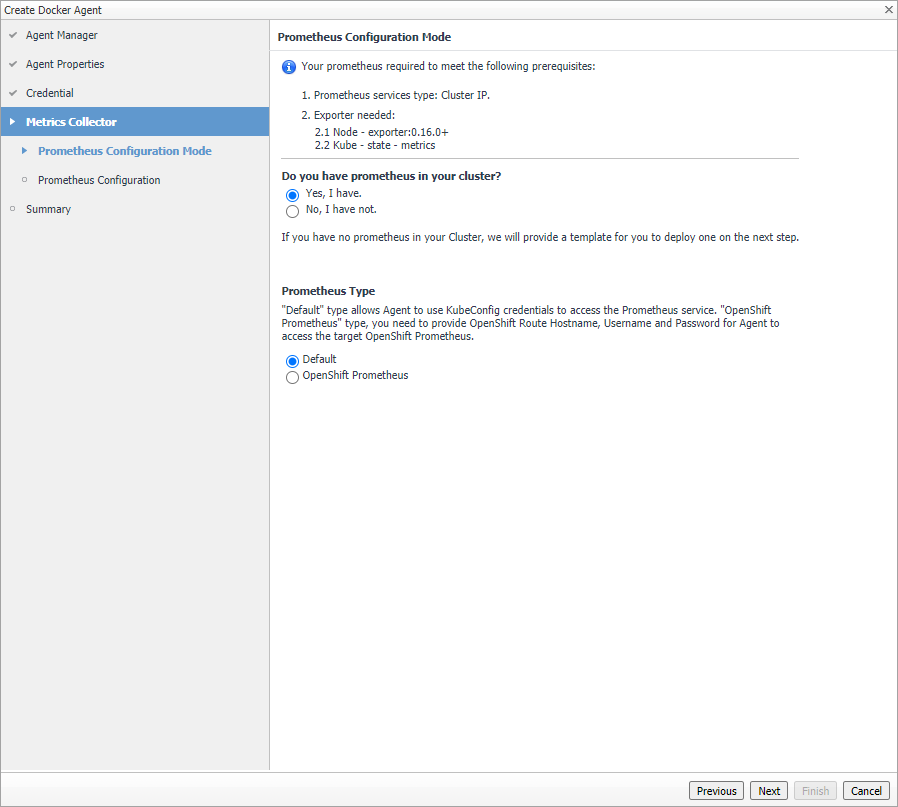 A Prometheus Configuration wizard will appear. To configure the metrics collector, either use the default Prometheus template or upload your own Prometheus deployment .yml files through Load from files.
