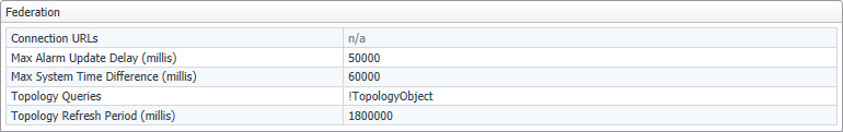 Max Alarm Update Delay (millis). The maximal delay in milliseconds that is allowed for the federation server to check all federated servers for alarm changes. This setting is defined by the MaxAlarmUpdateDelay parameter.