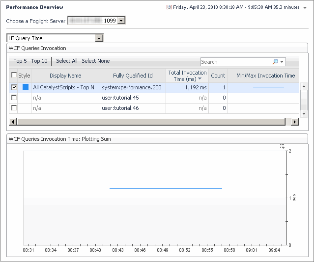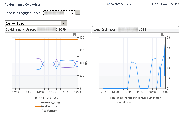 Contents of this view includes a drop down to select the host name. Here, you can select a Federation Master, Federation Child, or standalone server. To do that, click Choose a Foglight Server and select a host from the list that appears. It also contains the following embedded views:
