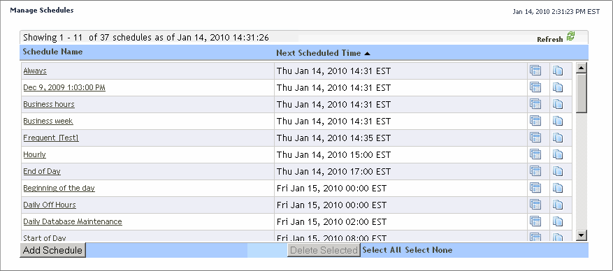 You can create and manage schedules using the Manage Schedules dashboard. To access this dashboard, from the navigation panel, click Dashboards > Administration > Schedules > Manage Schedules.