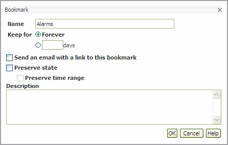 You create a bookmark by navigating to the dashboard you want to bookmark, selecting Bookmark from the action panel, and then selecting options from the Bookmark dialog box. See the online help for the Bookmark dialog box for details.