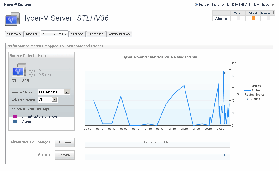The Hyper-V Explorer Event Analytics tab contains details about the state of resource-related metrics for a server or virtual machine over a selected time period, and also shows any events that occur during that time frame.