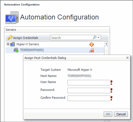 These actions require that you set up credentials for the virtual center on the Automation Configuration dashboard. To do that, on the navigation panel, under Dashboards, choose Hyper-V > Automation Configuration. On the Automation Configuration dashboard that appears, in the Servers view, select a Hyper-V server, click Assign Credentials, and provide host credentials in the Assign Host Credentials Dialog box. Failing to configure host credentials results prevents the automated tasks from being executed.