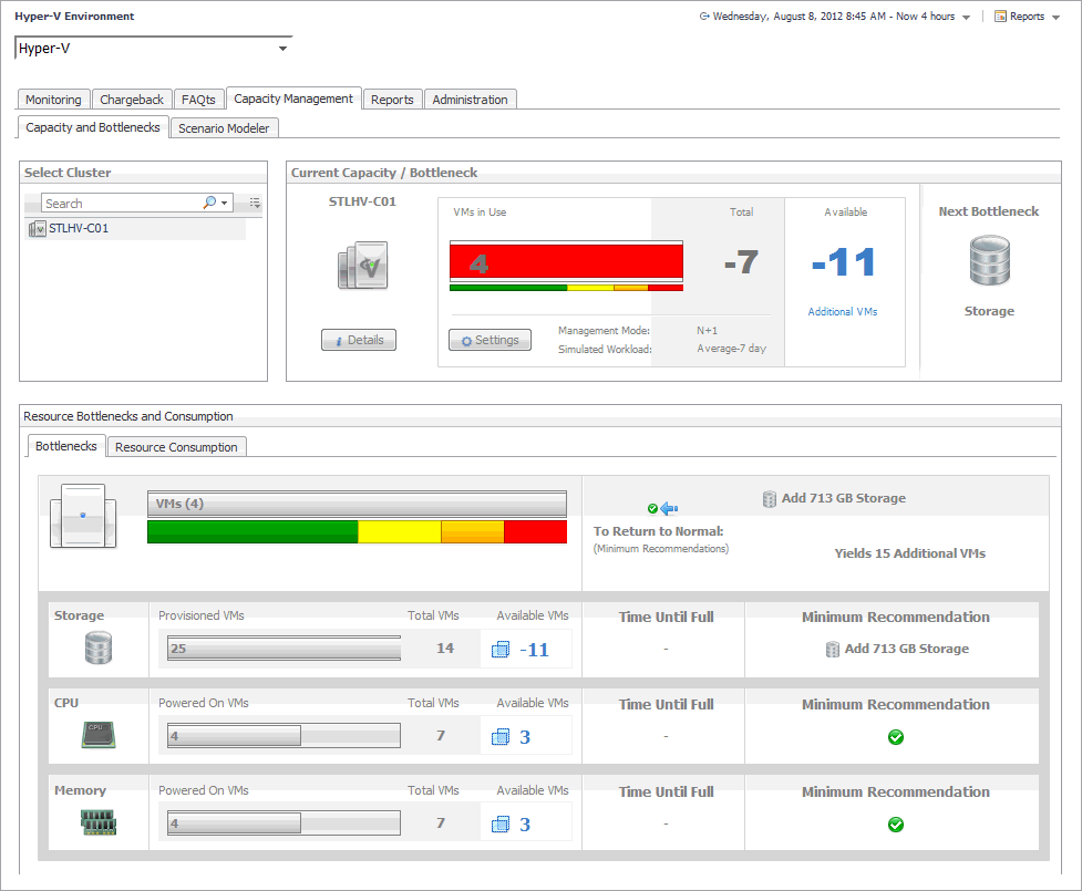 Larger distributed environments often require tools for accurately predicting resource consumption in order to plan for continuous expansion of virtual and physical machines and prevent bottlenecks in your production environment. The Capacity Management tab available on the Hyper-V Environment dashboard allows you to get insight into capacity bottlenecks and management.