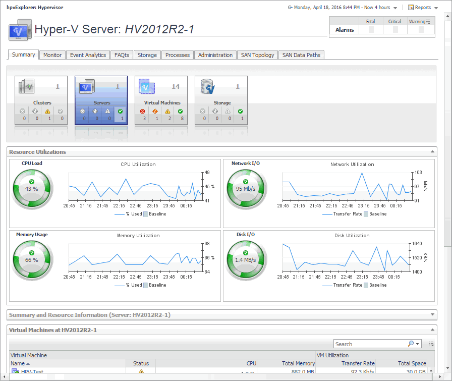 The Hyper-V Explorer Administration tab provides access to common administrative tasks. It also shows configuration details for a server or a virtual machine (depending on the selected object type), and some high-level information about the object’s resource consumption.