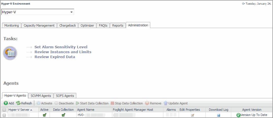 On the Hyper-V Environment dashboard that appears in the display area, click the Administration tab. |