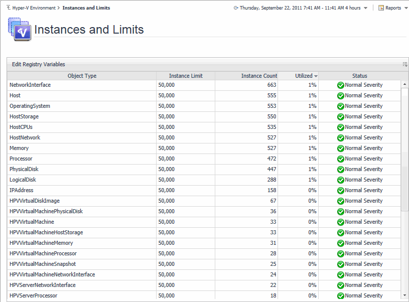 Explore the Instances and Limits view to see the existing Hyper-V object types. To access this view, on the Hyper-V Environment dashboard, open the Administration tab, and click Review Instances and Limits.