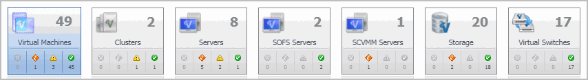 This view appears in the upper part of the Monitoring tab, just above the Quick-View. It displays a high-level overview of the selected virtual environment. The view has a tile for each type of object in your virtual infrastructure: Clusters, Servers, SCVMM Servers, SOFS Servers, Virtual Machines, Storage, and Virtual Switches.
