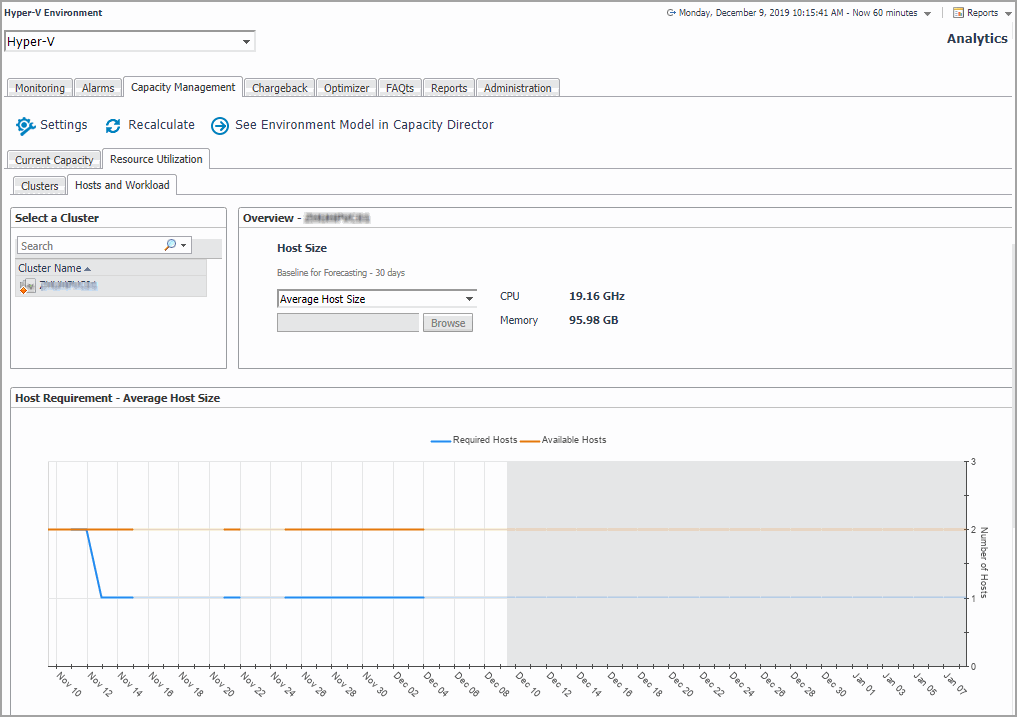 Larger distributed environments often require tools for accurately predicting resource consumption in order to plan for continuous expansion of virtual and physical machines and prevent bottlenecks in your production environment. The Capacity Management tab available on the Hyper-V Environment dashboard allows you to get insight into capacity bottlenecks and management.