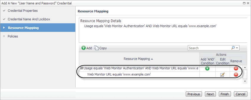 To get started, create a new credential of the User Name and Password type containing a resource mapping with the Web Monitor Authentication usage. Next, provide the URL address that requires these credentials, and save changes to the credential.
