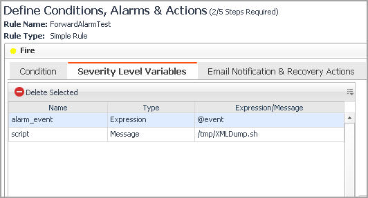 Click the Severity Level Variables tab to add the rule variables alarm_event and script and set the following: