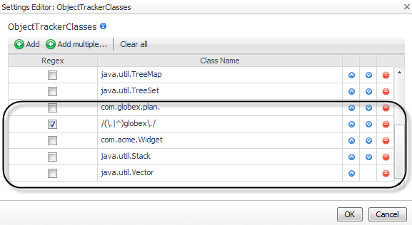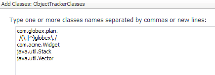 This example tracks all classes in the com.globex.plan package, but it does not track any other classes with globex in the name. It also tracks the com.acme.Widget class, as well as the listed collection classes.