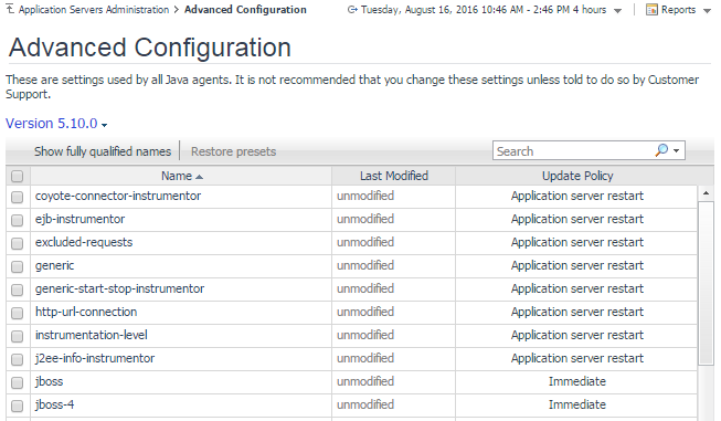 The Advanced Configuration view lists all available version-specific agent configuration files. Sometimes, you may need to manually edit these files. It is strongly recommended that you do not change any of these files unless you have been told to do so by Customer Support.