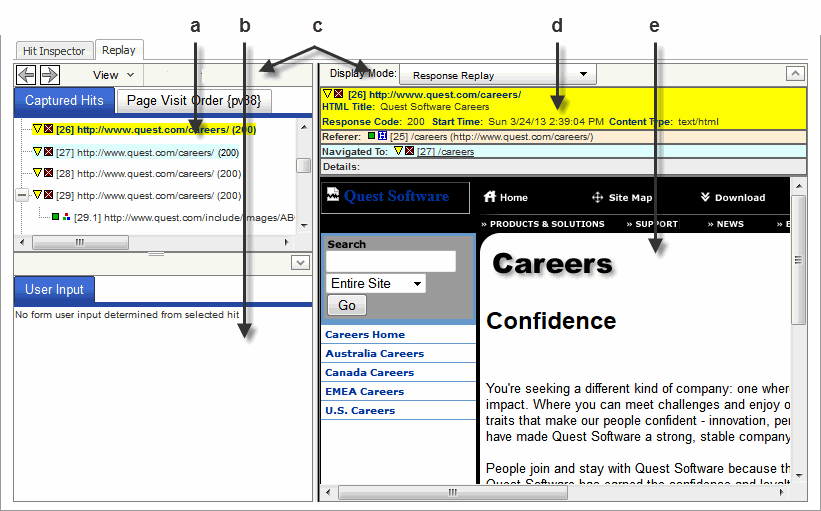 NOTE: Pages without HTML do not qualify for page replay. For example, applications such as Siebel, PeopleSoft, and SharePoint®, may contain pages without HTML. In addition, pages identified by user-defined URL classifiers may not qualify. In this case, use the Captured Hits tab instead.