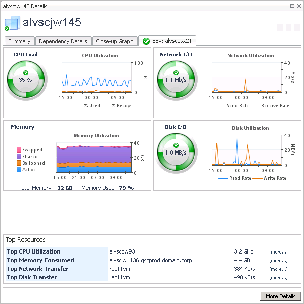 This tab displays the CPU, Memory, Network, and Disk utilization for the <hostname> from the perspective of the ESX® server. The lower part of the tab displays the top resource consumers for this host. From this tab you can navigate to the vmExplorer dashboard by clicking More Details. This dashboard allows you to further investigate the performance of the selected ESX® host.