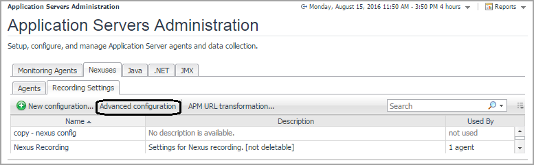 On the Nexuses view, click the Recording Settings tab and click Advanced configuration.