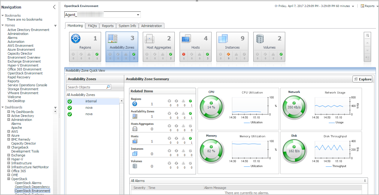 The navigation panel lists all the dashboards that are available to the current user for viewing. You can use the navigation panel to select a dashboard to view in the display area. To access a specific dashboard, open the appropriate module (OpenStack Dependency, for example).