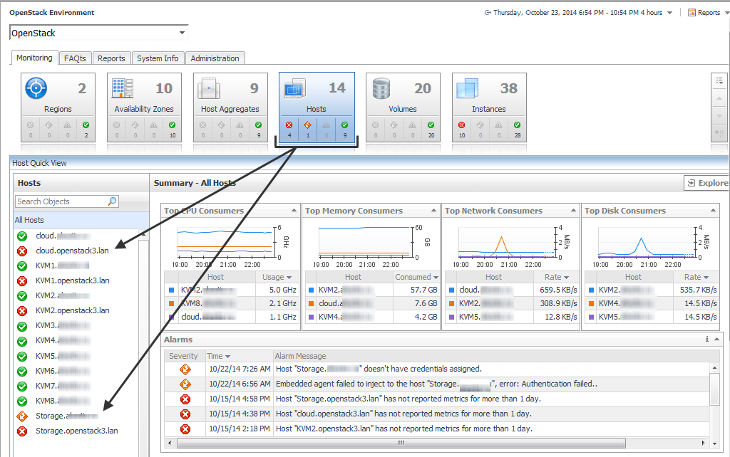 After installing Foglight for OpenStack, you can centrally manage your OpenStack cloud infrastructure resource objects. These resource objects include: Regions, Availability Zones, Host Aggregates, Hosts, Instances, and Volumes.