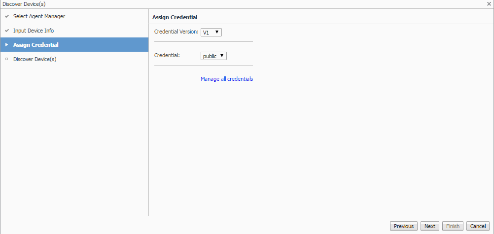 From the Discover Device(s) wizard, you can add new credentials by clicking the Manage all credentials link. For more information, see Accessing the Manage all credentials wizard.