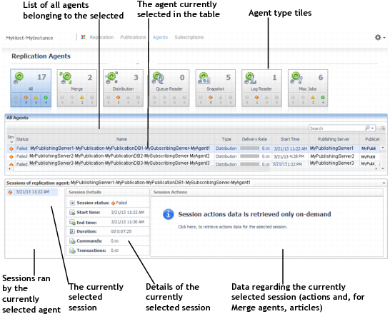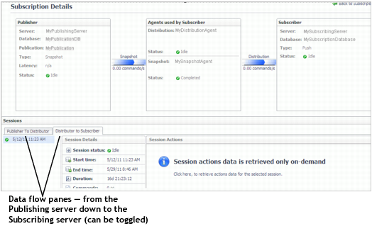 Publisher to Distributor — displays the session actions of the Snapshot or Log Reader agent.
