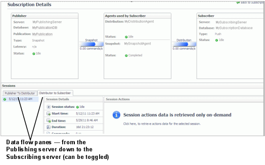 Publisher to Distributor — displays the session actions of the Snapshot or Log Reader agent.