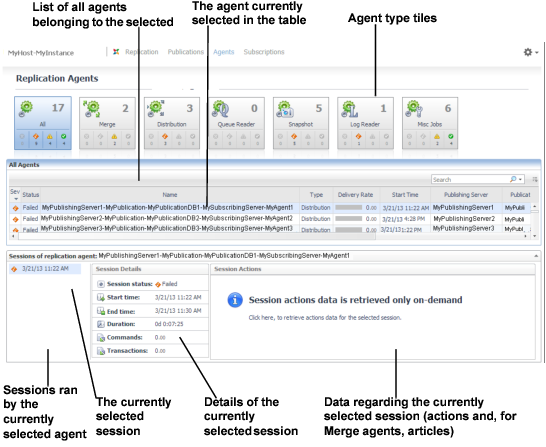 The lower section of the Replication Agents drilldown displays agent-specific session data for all agents whose type is other than Misc. Jobs.