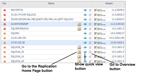 Upon the configuration as a distributor for monitored instances. Instances detected as distributors appear with the button Go to the Replication Home Page () next to the Show quick view button on the Name column of the Databases table.