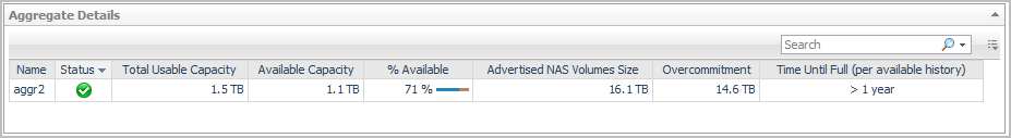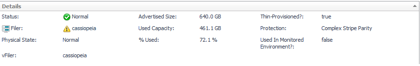 Details. Displays the volume’s status, physical state, physical details, parent devices, and alarms on disks in the volume. Also displays current values for Advertised NASVolumes Size, Used Capacity, and % Used.