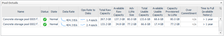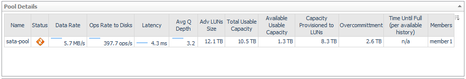 EqualLogic storage arrays—Displays the same information as the Pool Details view on the Pools-Members tab of the EqualLogic Storage Array dashboard, but the data reflects only the pools relevant to the selected LUN. For more information, see Dell EqualLogic Storage Array.