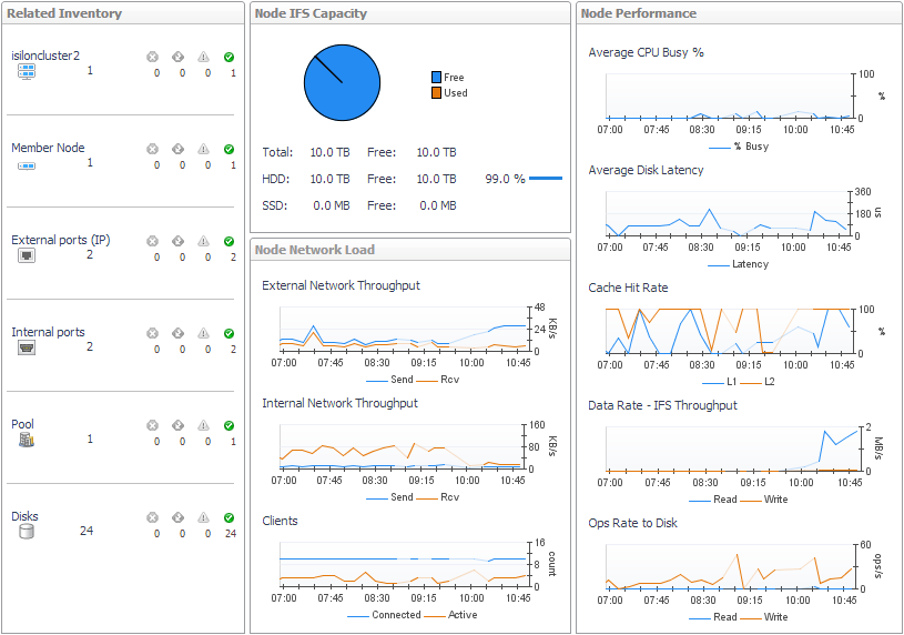 The data displayed in the dashboard reflects values for the selected Isilon node over the time range. This walkthrough describes the contents of each of the tabs.