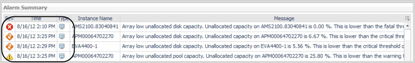 When a storage device or component enters an unacceptable state (as defined in a rule), the rule that monitors the entity triggers an alarm and sets the status of the resource. Examine the alarm messages starting with the most severe alarms.