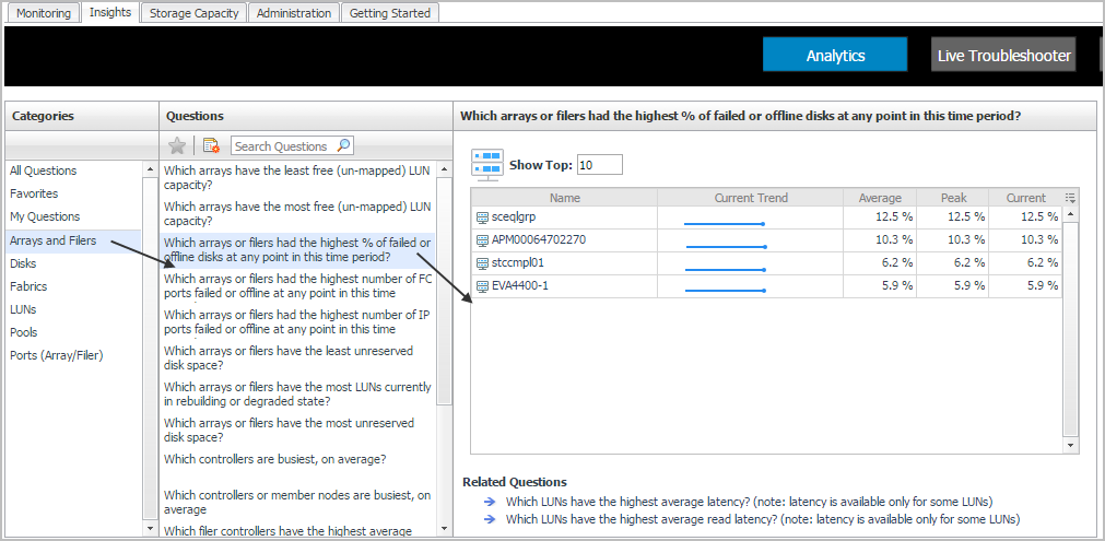 Another way to find out information about your storage environment is to ask questions. The Insights tab contains the Analytics view to show frequently-asked questions about storage environments. Answers are displayed in the form of tables and graphs. You can select questions that apply to all storage resources or to a specific type of storage resource.