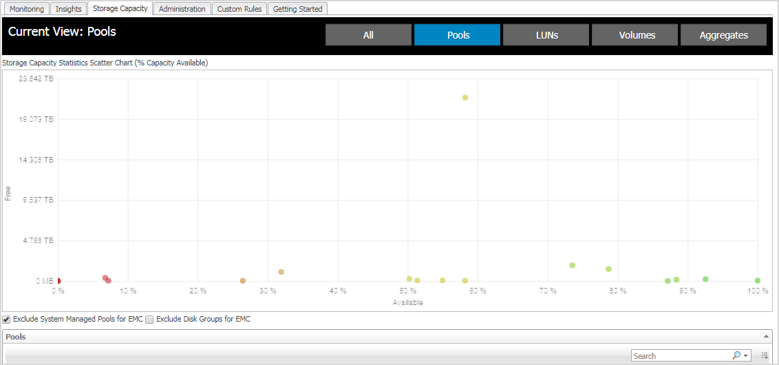 The middle part of the view includes the Storage Capacity chart, which shows the pools with the scatter chart that uses Free as Y axis and Capacity Available Percent as X axis.