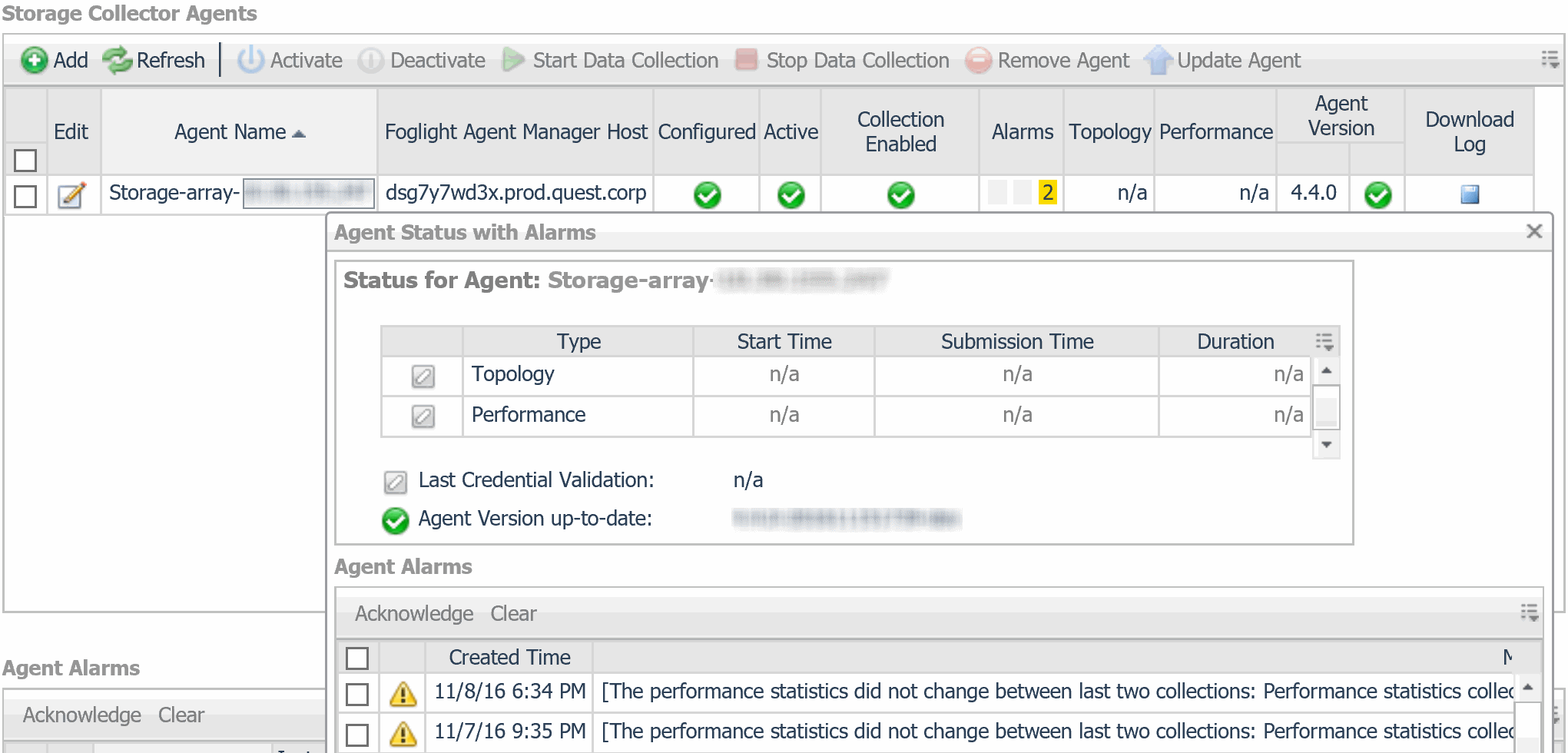 The Agent Alarms view shows the alarms that have been triggered, but not cleared for the Storage Collector agents. Failure to fix a chronic problem may cause the agent to stop collecting data. Note the following: