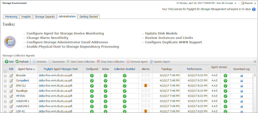 After you create agents, you can check their status and alarms. Over time, you may need to edit configured agents. You complete these tasks on the Storage Environment dashboard under the Administration tab.