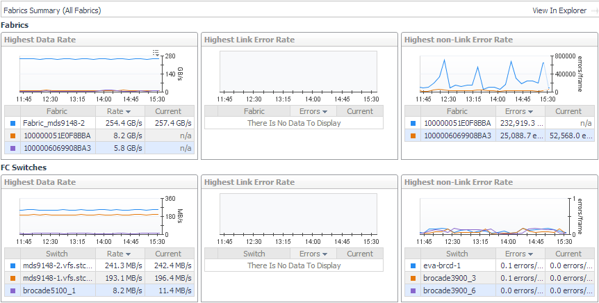 The Fabrics Summary (All Fabrics) panel opens. The Fabrics view identifies the top three fabrics with the highest average values for Data Rate, Link Error Rate, and Non-Link Error Rate, respectively. The FC Switches view identifies the top three switches in terms of the same metrics. The charts plot the metric values over the time period, while the tables show the average and current values for each component.