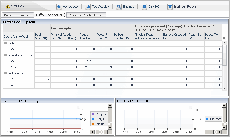 The Buffer Pools dashboard provides performance details for cache operations. This dashboard contains the following: