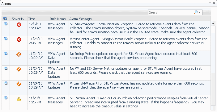 Drill down on any alarm count. Displays the Alarms dialog box that shows a list of all alarms associated with the selected component type.